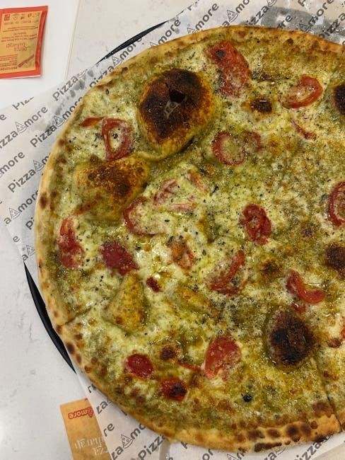 Add your desired toppings‚ such as pepperoni‚ sausage‚ or vegetables‚ in a balanced amount. Sprinkle oregano‚ basil‚ or garlic powder for extra flavor. Avoid overloading the pizza to prevent sogginess. For a gourmet touch‚ drizzle olive oil and sprinkle parmesan cheese. Keep seasonings light to enhance‚ not overpower‚ the natural flavors of the cheese and sauce.